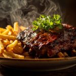 8. Let ribs rest briefly. Slice between bones and serve with fries that are golden and audible when broken – crisp exterior, pillowy center. The contrast of sticky, smoky ribs and sizzling, salty fries is the reward.